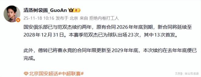 本赛季的北京国安队有着一段波折的联赛历史。年初他们喊着争冠口号,但赛季后半段成绩下滑,很快就从冠军队伍中跌落。北京很多球迷都感到焦虑,因为俱乐部正经历严重的财务危机,很多球员的续约还没有敲定。而就在本赛季中超联赛即将结束之际,国安俱乐部终于行动起来,与曹永竞和范双杰两名主力球员续约。对于陷入危机的国安队来说,两次续约绝对是个好消息。据北京某知名体育博主透露,国安刚刚与20岁球员范双杰续约,将原定于2026年底到期的合同再延长两年。此外,著名足球转会数据网站德专网也已更新了国安球员合同数据。曹永竞与俱乐部的合同将于2029年底到期。届时,曹永竞将年满32岁,很可能会留在国安队。作为一名现役国脚,28岁的曹永竞本赛季在国安队达到了职业生涯的巅峰。他出色的足球智慧、出色的球技和意识赢得了前主帅塞蒂恩的高度评价,并成为国安队的主力右前卫。本赛季,曹永靖在中超第24轮比赛中替补国安出战,打进3球,助攻2次。他是库尼亚本土球员中出场次数最多的。与曹永竞相比,年轻的范双杰显然有些稚嫩,但他也被塞蒂恩回收,一度成为国安的主力中场和中卫。不过,年仅20岁的范双杰显然还没有做好作为国安主力出战的准备。虽然他的技术水平很高,但是他太瘦了而且缺乏比赛经验,这限制了他在队内的发挥。由于斯帕季奇重伤且长期缺阵,加杜数次回国参加世界杯预选赛,范双杰则被推上主力中卫位置。不过,在中超和亚冠的几场比赛中,他犯了一些不应该犯的低级错误,引起了很多球迷的批评。尽管如此,范双杰依然是国安队未来的希望。他将他与国安的“王子”相提并论并不为过。在他的合同还剩一年的情况下,俱乐部与他续签了一份为期两年的新合同,这足以表明他的能力得到了球队的一致认可。从目前的情况来看,范双杰需要通过训练不断提升自己的力量和对抗能力,在比赛中变得更加勇敢和凶猛。再者,国安的防守需要一个“大b”就位置而言,范双杰的身高和踢球能力更适合踢中场,而不是中卫。下赛季国安队主帅更换教练后,需要考虑这个问题,将小范用在最佳位置,这也将导致他的快速成长。另外值得一提的是,除了范双杰和曹永靖之外,国安目前还有六名与俱乐部合同到期的球员。从目前的情况来看,老将王刚和池忠国下赛季留队的可能性也很大,希望尽快做出决定,而不是等到国安俱乐部重获自由之后再被其他俱乐部挖走。是郭安。
