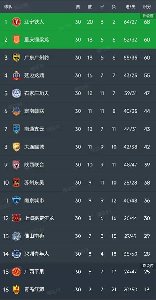 北京时间11月8日,中甲联赛第30轮结束。晋级和降级球队均已公布。让我们来看看最终的排名吧!最新一期中甲联赛的冠军是辽宁铁人队和重庆铜梁龙队。辽宁铁人很快就确定了下赛季中超联赛和本赛季中甲联赛冠军的资格。最后一轮以5-0的大比分结束。安一言上演帽子戏法,易宇班本和张一峰也贡献了自己的力量。最终,辽宁铁人以20胜8平2负积68分,以冠军身份进入中超联赛。昔日的辽猛队给球迷留下了深刻的印象。虽然现在的辽宁铁人已经不是以前的辽猛虎了,但他们依然是辽宁足球的一部分,也是东北足球的一支主力军。希望你们下赛季也能在中超联赛中取得好成绩。辽宁铁人夺得中国男篮冠军联赛1.重庆同梁龙与广东广州豹本轮前积分相同。重庆铜梁龙积分排名靠前。今天,重庆通良龙的对手是上海嘉定汇龙。只需要3分就足以晋级联赛。压力之下,当何塞·卡里略和莱昂纳多·席尔瓦在第72分钟和第82分钟分别进球时,重庆球迷终于松了口气。他们以2-0击败上海嘉定汇龙。重庆成功晋级中超。虽然广东广州豹队获胜,但重庆铜梁龙队获得第二名,获得下赛季中超联赛的参赛资格。重庆通良龙2021年才成立,一年一步,帮助重庆足球重返中超境界。下赛季的中超联赛将有三支西南球队:成都成都队、重庆铜梁龙队和云南玉坤队,也被球迷亲切地称为““泽根队”。广东广州豹队第3名 广东广州豹队以3-1战胜南通支云队。他们在积分上与重庆铜梁龙之队打成平手,但由于战绩不佳,遗憾地保持在第三位,错过了翻盘的机会。上赛季,广州队排名第三,无缘参加中超联赛,最终被解散。广州足球的恢复还需要时间。祝广州足球俱乐部一切顺利!我们来看看降级区。遗憾的是,广西平果队和青岛红狮队排名倒数第二。最终广西平果队以1-5不敌陕西联队。他们仅积25分,落后倒数第二的深圳青年3分。青岛红狮本赛季仅取得2场胜利,积13分排名积分榜末位!